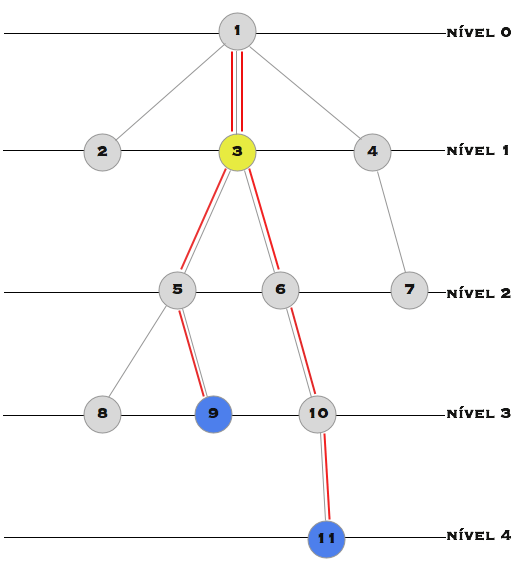 Se montarmos o grafo das cartas, vemos que o grafo tem que ser uma árvore. Podemos enraizar a árvore num vértice qualquer (vamos enraizar no vértice 1, por simplicidade). Então, na seguinte figura, vamos ver como podemos calcular a distância do vértice 9 ao vértice 11.