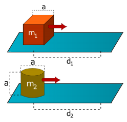As figuras abaixo mostras duas situações, nas quais dois blocos de formas cúbica e cilíndrica feitos de material, homogêneo, isotrópico com distribuição uniforme e que serão lançados sobre as superfícies horizontais e rugosas de mesmo coeficiente de atrito. Os blocos cúbico e cilíndrico são lançados com as energias cinética