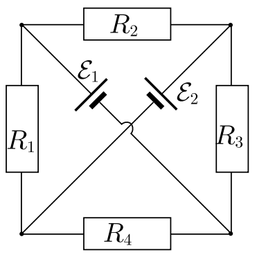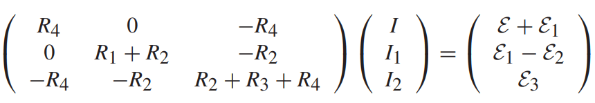 Utilizando lei das malhas (utilizando o método do ‘loop”, onde cada malha está associada a uma corrente. A única diferença desse formalismo é que as equações de conservação de corrente em cada nodo são satisfeitas automaticamente. Para obter a corrente real em algum trecho, deve ser feita a soma algébrica das correntes de malhas adjacentes), chegamos nas seguintes equações: