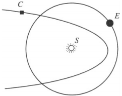 Encontre o tempo máximo que um cometa (C) de massa m que segue uma trajetória parabólica em torno do Sol (S) pode passar dentro da órbita da Terra (E).Suponha que a órbita da Terra é circular e no mesmo plano que a do cometa .