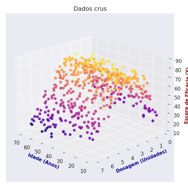 Para deixar isso mais claro, vamos imaginar a seguite situação: você quer fazer um modelo que diz o quão efetivo cada dose de um medicamento é, em diferentes pessoas. Para fazer isso, você coleta alguns dados de hospitais que testaram diferentes doses de um medicamento em pacientes, e anotaram o efeito. Aqui está o que você conseguiu de dados: