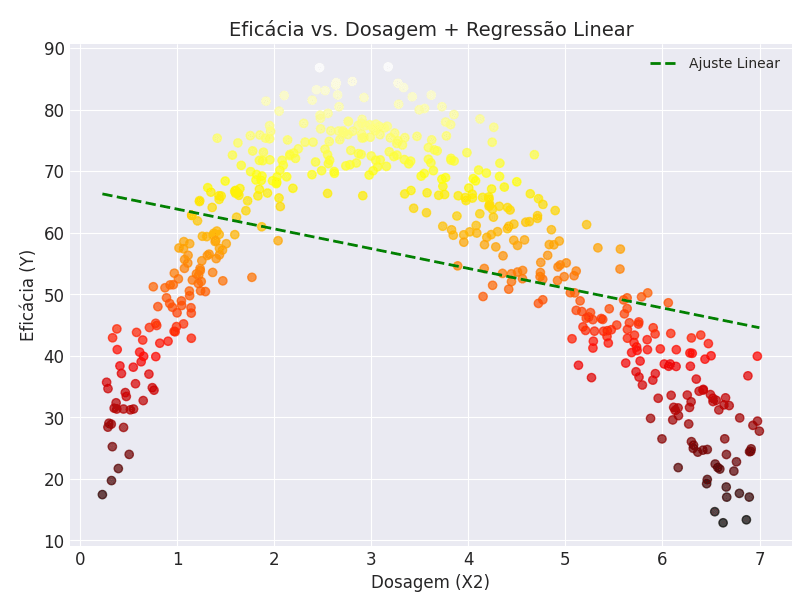 Mas, pensando sobre o funcionamento da regressão linear, algo fica claro: O problema não está em como você usou o algoritmo, está no algoritmo em si. Como o próprio nome diz, a regressão linear modela relações lineares entre features (neste caso, a dosagem) e o valor alvo (neste caso, a eficácia). Ou seja, ela funciona se um é *linearmente* proporcional ao outro (y aumenta quando x aumenta; ou y diminui quando x aumenta). Mas, nesse caso, a relação não é linear: a eficácia (y) pode tanto aumentar quanto diminuir de acordo com a dose (x): tanto doses pequenas quanto doses altas são ineficazes.