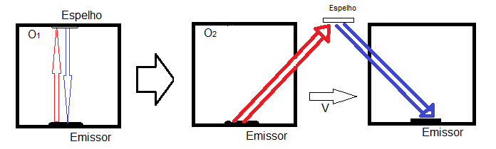 Agora imagine o seguinte plot: Dentro de um vagão deum trem de altura H temos um emissor (que também atua como receptor) de lasers e um espelho acima deste..O vagão se move com