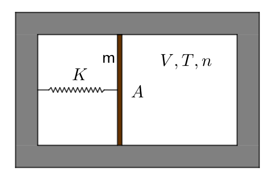 Um gás com n mols e temperatura T está num recipiente de paredes adiabáticas, ocupando um volume . Têm-se um êmbolo de massa m e área A ligado a uma mola de constante elástica K e comprimento relaxado x_o. Na situação de equilíbrio, o gás ocupa um volume V, ficando apenas à direita do êmbolo. Determine o período de pequenas oscilações do êmbolo.
