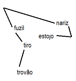 Olhando para os dois grafos feitos, temos que “trovão” pode ser “onoj” ou “moŋer”. Não pode ser “legu” porque ele não aparece sozinho, só com uma palavra composta e não pode ser “cireme” porque “nime” que seria “fuzil” se relaciona com três palavra, enquanto “fuzil” só com duas.
